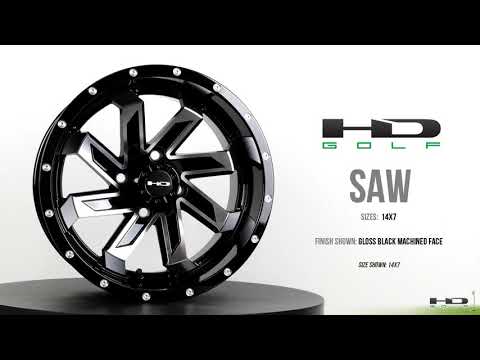 This is the HD Golf SAW. The Saw has a badass saw blade design that's sure to be noticed, by everyone. This wheel also features a deep flat lip. All HD Golf Wheels use our snap-in center cap. This wheel is offered in 4 menacing finishes, and all of them will make any lifted or non-lifted golf cart look a lot more hardcore. The Saw is available in a variety of sizes, to fit a wide range of lifted & non-lifted golf cart models. Make your golf cart feared by the rest... on the HD Golf SAW!